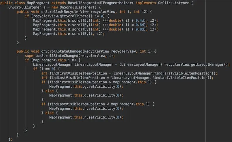 em…布局和我们adb dumpsys的内容一样,五个RecyclerView,接着打开MapFragment开始跟代码,