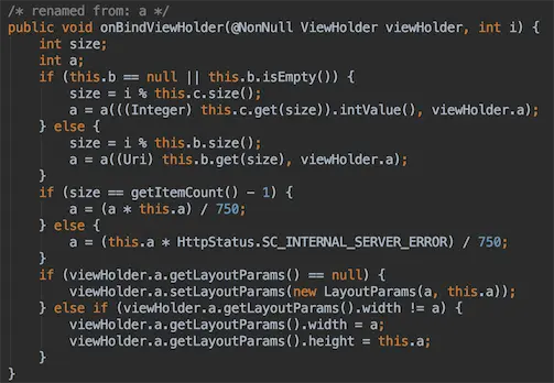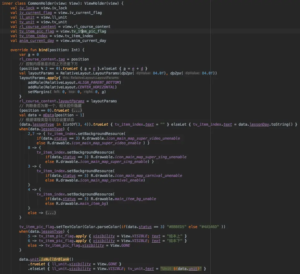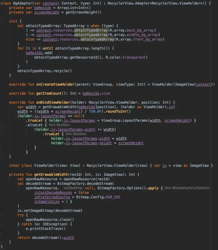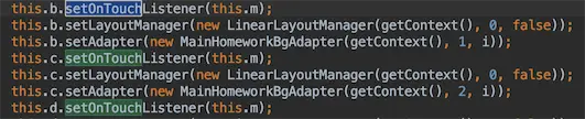 不过,学过性能优化的都知道:「应尽量减少不必要的布局层次嵌套」,我们这样玩的话,要叠三层ConstraintLayout… 其实吧,动态添加一个ImageView就好了,只是要 确定(计算) 好它具体的宽高。啧啧,看下APP是如何实现的,搜文件 MainHomeworkBgAdapter,定位到 setLayoutParams:
