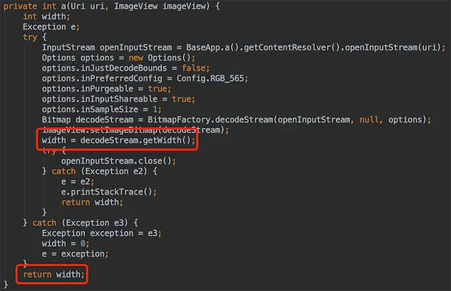 噢,执行a函数,作用:利用Bitmap获取图片宽度返回,同时ImageView设置图片。