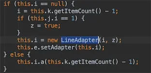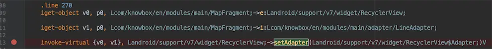 接着到虚线列表,打开res和assets没发现虚线图片,应该就是自定义View了,回到 MapFragment.kt,定位到设置adapter的位置,可以看到这个LineAdapter: