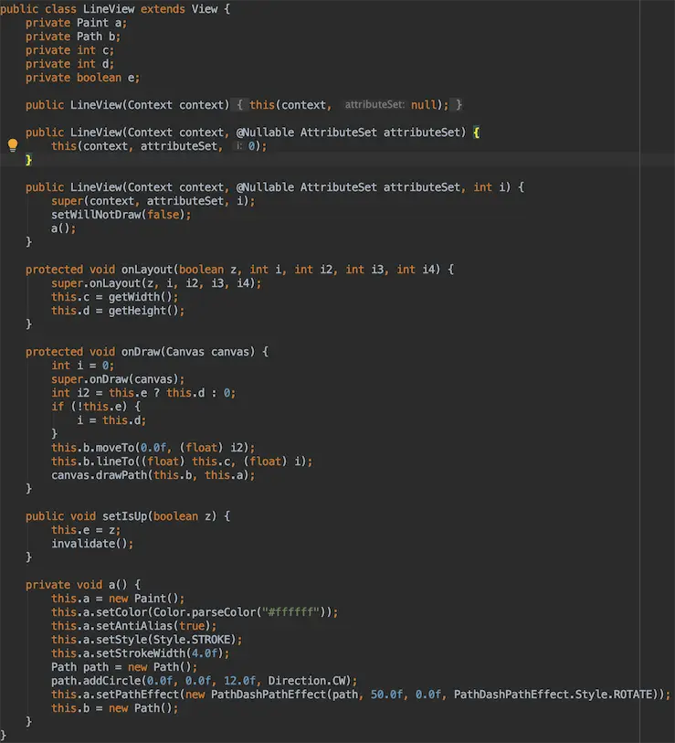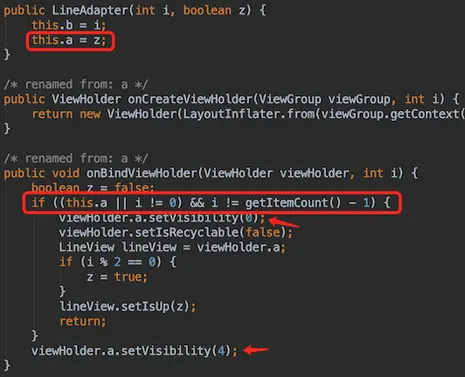 先是SetVisibility这里,0和4分别是「VISIBLE」和「INVISIBLE」,接着是圈住的判断条件:头尾虚线不显示可以理解,就是这个this.a 是干嘛的?直接搬运代码,看下不判断会怎样: