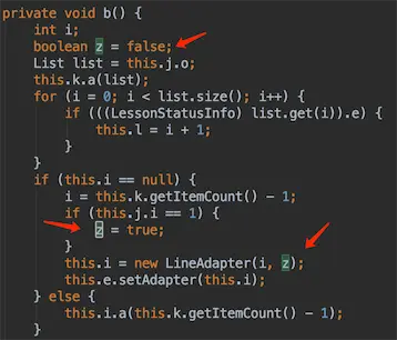 可以看到传入Adapter的参数50和true,然后是这个this.j.i,但是确是一个字符串:“1-49”,卧槽,判断字符串是否等于整数??? 什么鬼?