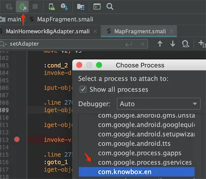z的初始值为false,判断了一波this.j.i是否等于1,是的话等于true,那么this.j.i到底是啥?这里就不跟了,直接用「smail动态调试」这个APP,「前戏如何准备,下一节教你」,这里假设前戏已做好,开始调教~ 找到大概的位置下断点: