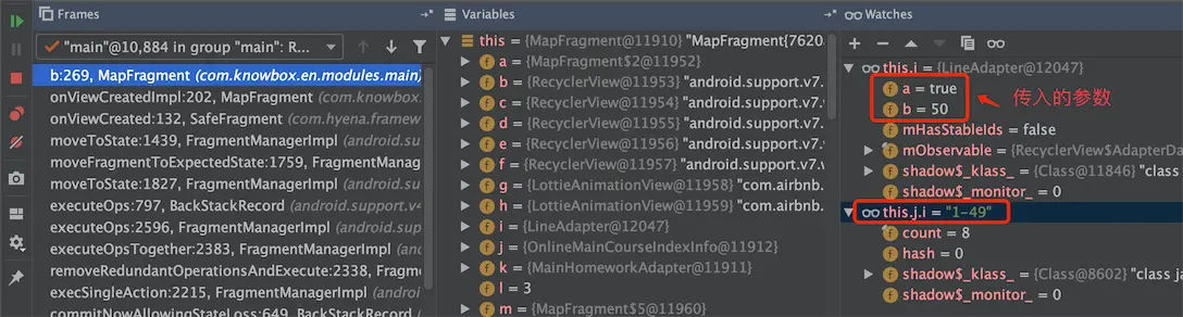 来到断点位置,程序会自动挂起,AS弹出Android Debugger窗口。