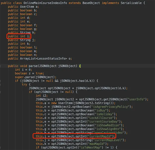 从parse那里可以看出这个i应该是当前地图的ID,但是却变成了“1-49”,这个更像j当前地图等级吧,而g更像是openCartoonVideo,这里应该懂了吧,不是一一对应的!所以其实对应的参数是h,即1,代表第几关,那直接忽略吧,修改后的代码如下: