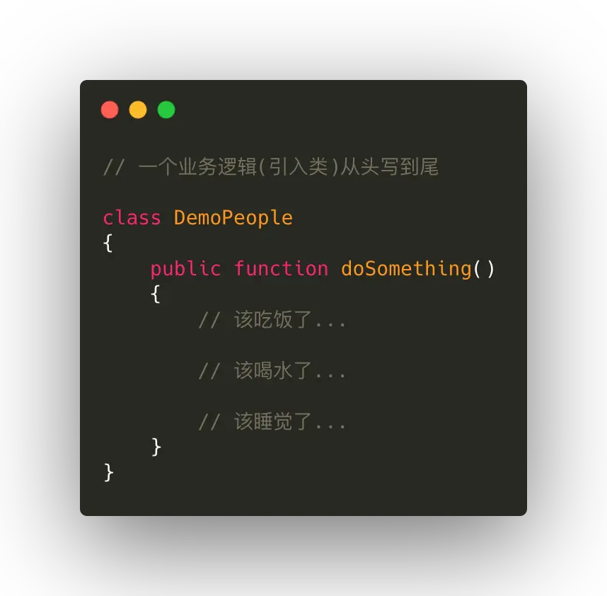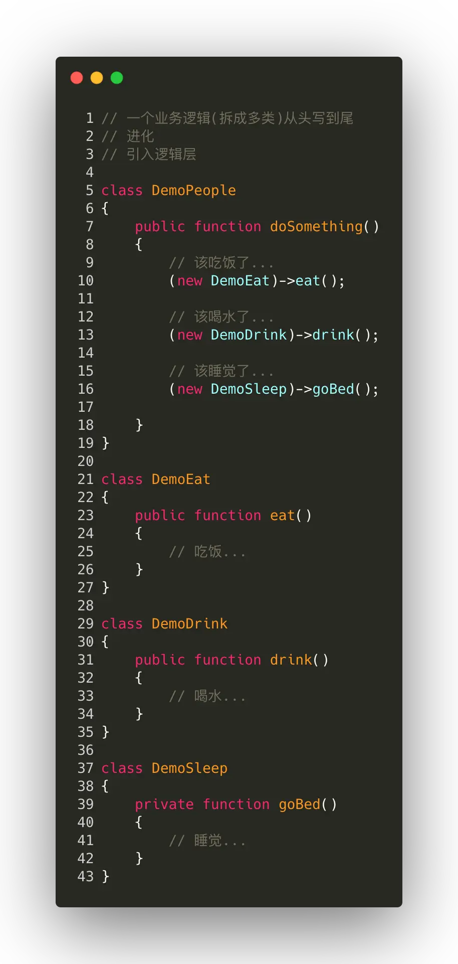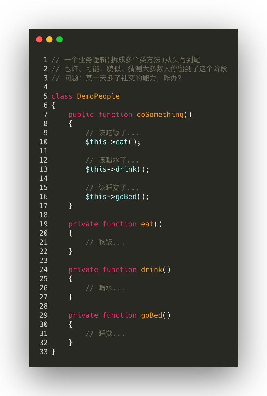一个业务逻辑(拆成多个类方法)从头写到尾,也许、可能、貌似、猜测大多数人停留到了这个阶段。 问题:某一天多了社交的能力,咋办?