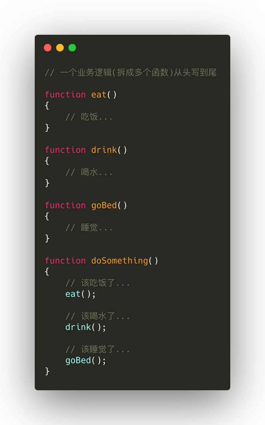 一个业务逻辑(拆成多个函数)从头写到尾: