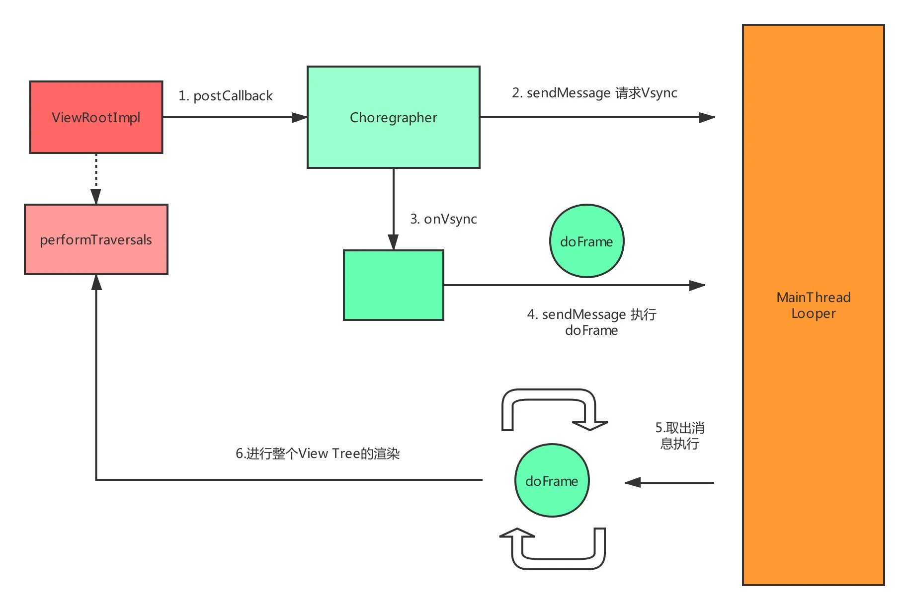 即Choreographer在接收到Vsync信号后会向主线程消息循环中发送一个消息,这个消息在运行的时候会调用doFrame():