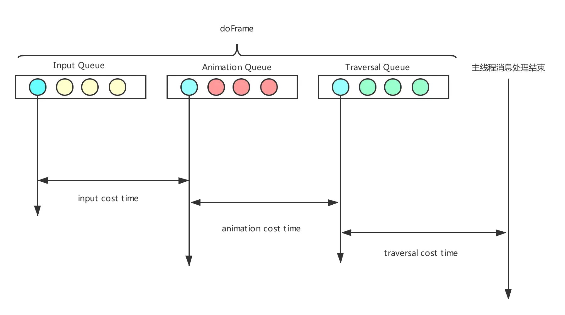 所以在主线程处理完消息时我们就可以计算出一帧中各个事件的耗时: