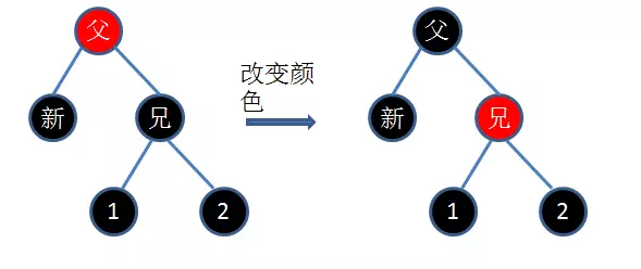 * 红父二黑侄:将父节点变成黑色,兄弟节点变成红色,新节点变成黑色即可,如下图所示