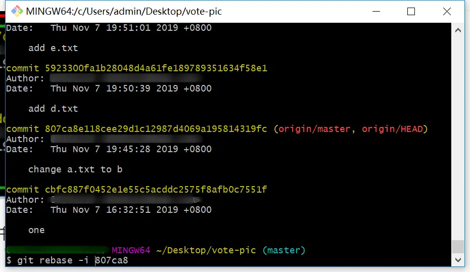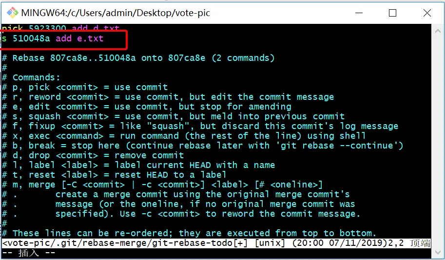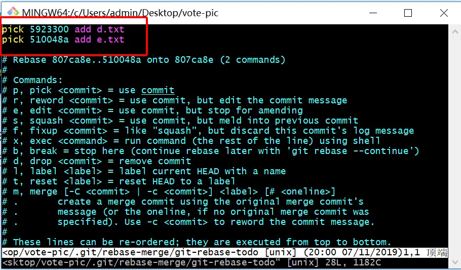 我们想要合并的两个commit记录显示在了顶部, 然后键入i可以进行编辑,