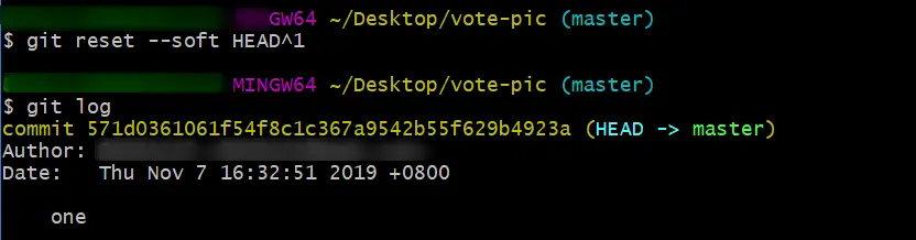 再git log 发现,最新的提交已经不存在了,只剩一个提交。HEAD^1指向HEAD之前的一个提交。