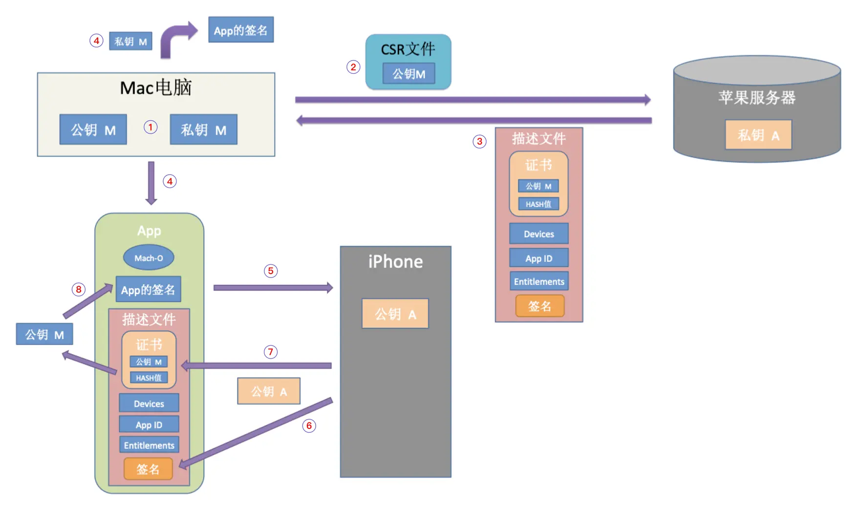 iPhone手机在出厂后,其中就保存有苹果官方的公钥);在Mac系统打包app时也会生成一对密钥(私钥、公钥),并保存在钥匙串中。为了区分这两对密钥,将苹果官方的那对密钥记为A,即私钥A、公钥A;将Mac系统生成的那对密钥记为M,也就是私钥M、公钥M。