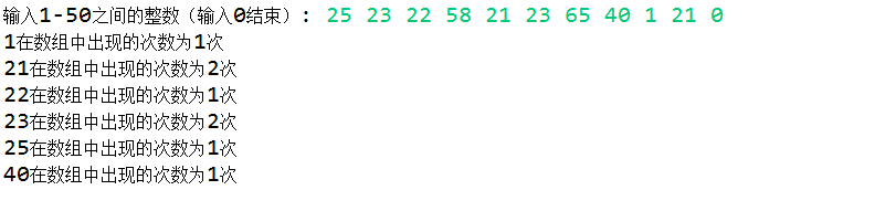 编写程序,在测试类主方法中读取1-50之间的整数,保存在数组中,然后计算每个数出现的次数。假定输入是以0结束的。以下是程序运行示例: