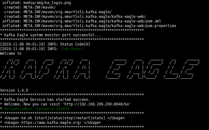 [root@izwz9epn1rca85wtznqxwhz kafka-eagle]# bin/ke.sh start