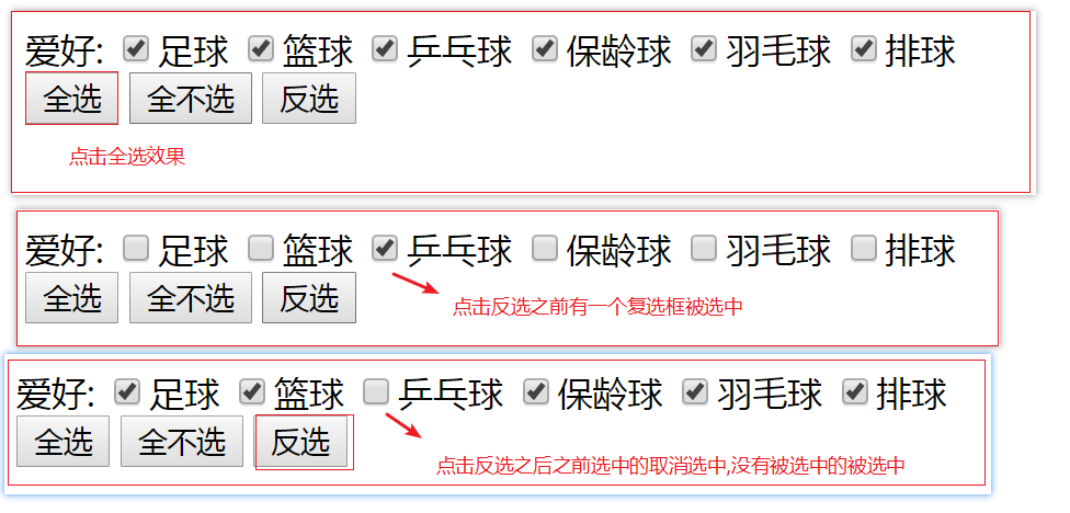 01 02 03 04 05 06 07 08 09 10 11 12 13 14 15 16 17 18 19 20 21 22 23 24 25 26 27 28 29 30 31 32 33 34 35 36 | <!doctype html><html lang="en"><head> <meta charset="UTF-8"> <title>Document</title> <script src="./jquery.min.js"></script></head><body> 爱好: <input type="checkbox" name="hobby[]">足球 <input type="checkbox" name="hobby[]">篮球 <input type="checkbox" name="hobby[]">乒乓球 <input type="checkbox" name="hobby[]">保龄球 <input type="checkbox" name="hobby[]">羽毛球 <input type="checkbox" name="hobby[]">排球 <br> <button id="btn">全选</button> <button id="btn1">全不选</button> <button id="btn2">反选</button> <script> //设置文本输入框不可用,设置能够使用就将true改成false $("input[type='text']").prop("disabled",true); $("#btn").click(function(){ $("input[type='checkbox']").prop('checked',true); }); $("#btn1").click(function(){ $("input[name='hobby[]']").prop("checked",false); }); $("#btn2").click(function(){ var lis=$("input[type='checkbox']"); for(var i=0,sum=lis.length;i<sum;i++){ $(lis[i]).prop('checked',!$(lis[i]).prop('checked')); } }); </script></body></html> |