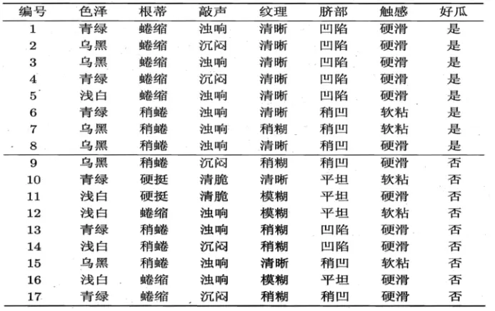 # ['编号' '色泽' '根蒂' '敲声' '纹理' '脐部' '触感' '好瓜']