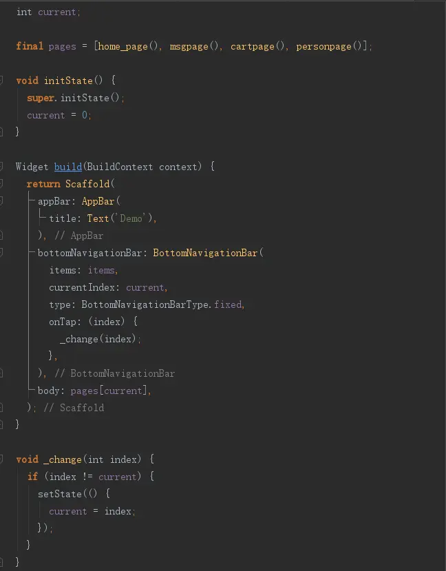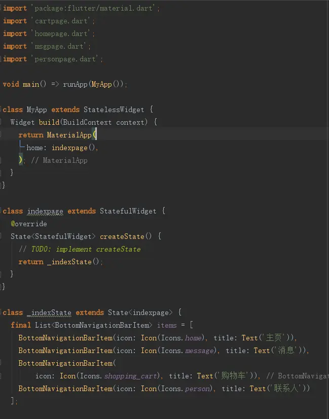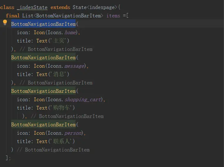 Flutter组件BottomNavigationBar学习记录 月下西楼 2019-11-08 181 阅读1分钟 BottomNavigationBar用于设置底部导航栏。 BottomNavigationBar的属性 BottomNavigationBarItem的属性 具体步骤 1.先创建要用的页面 2.定义BottomNavigationBar的item 3.设置BottomNavigationBar 完整代码