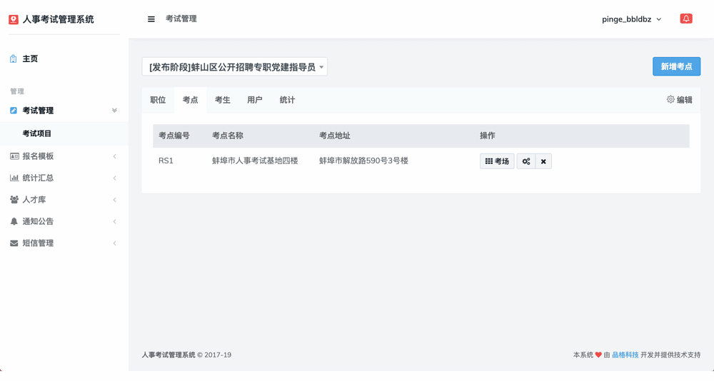 1 一键批量生成考场: 根据各岗位报考的人数,系统可自动以批量形式生成各个考场,可自定义考场座位数,亦支持手动模式。