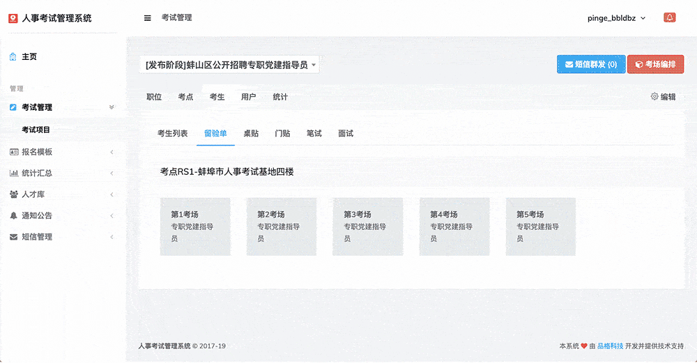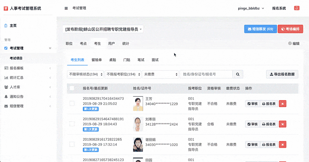首先,我们的系统包含了招聘公告发布、网上报名、资格审查、在线缴费、考场设置、座位自动编排、准考证生成及打印、成绩查询、面试通知单、短信群发、数据导出Excel、自动生成人才库信息等覆盖人事考试(报名)与考务管理全套业务流程的功能。