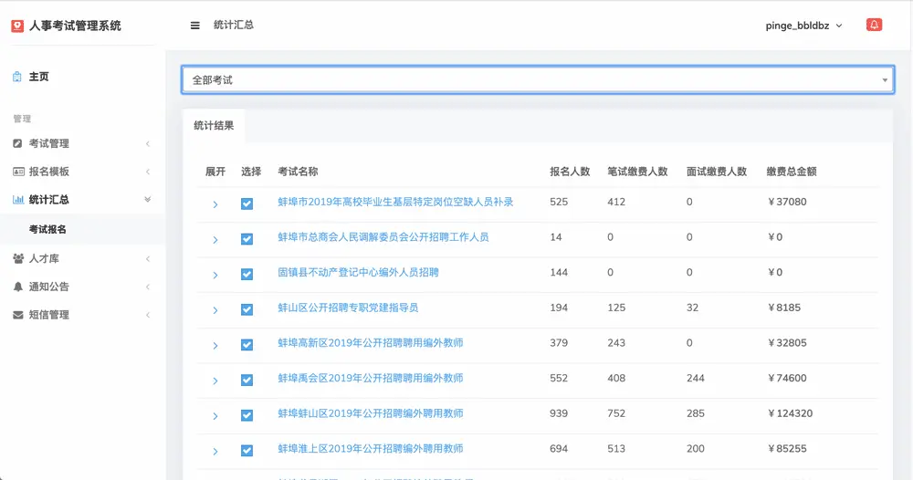 4 考务统计与汇总: 考务统计支持单个考试统计,亦可将各个考试合并统计,满足不同的统计需求。在汇总统计状态下,还可以手动进行选择,可精确到岗位统计。