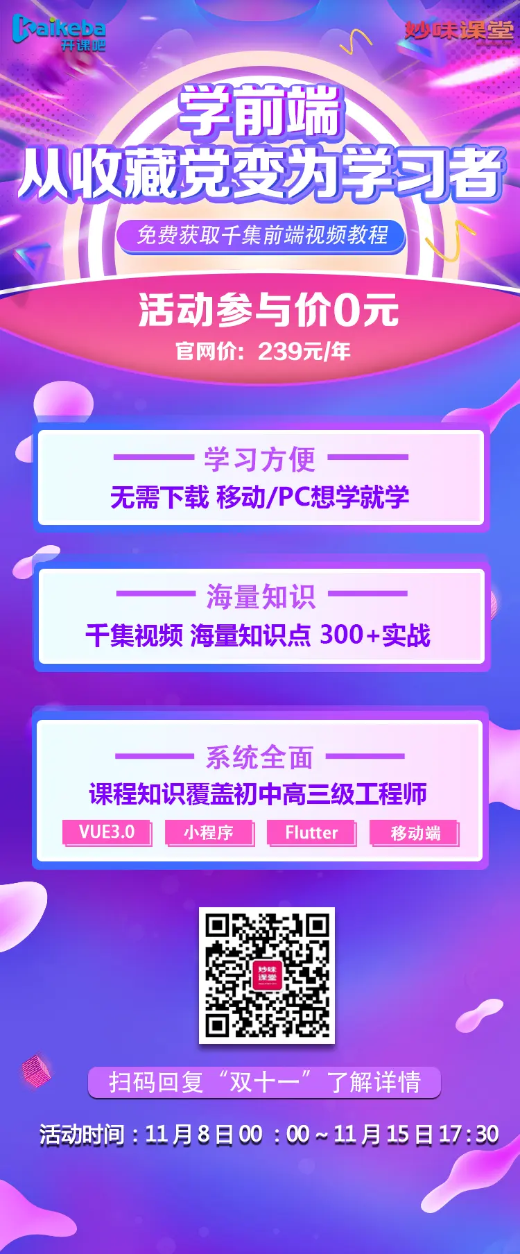 看这里☞:活动期间被推荐新注册妙味官网的用户也同样有福利得哟,立即联系下方客服,免费领取7天妙味VIP视频学习权限吧,当然啦,你也可以同时参与双十一推荐活动赢取更多妙味VIP视频学习时长哟