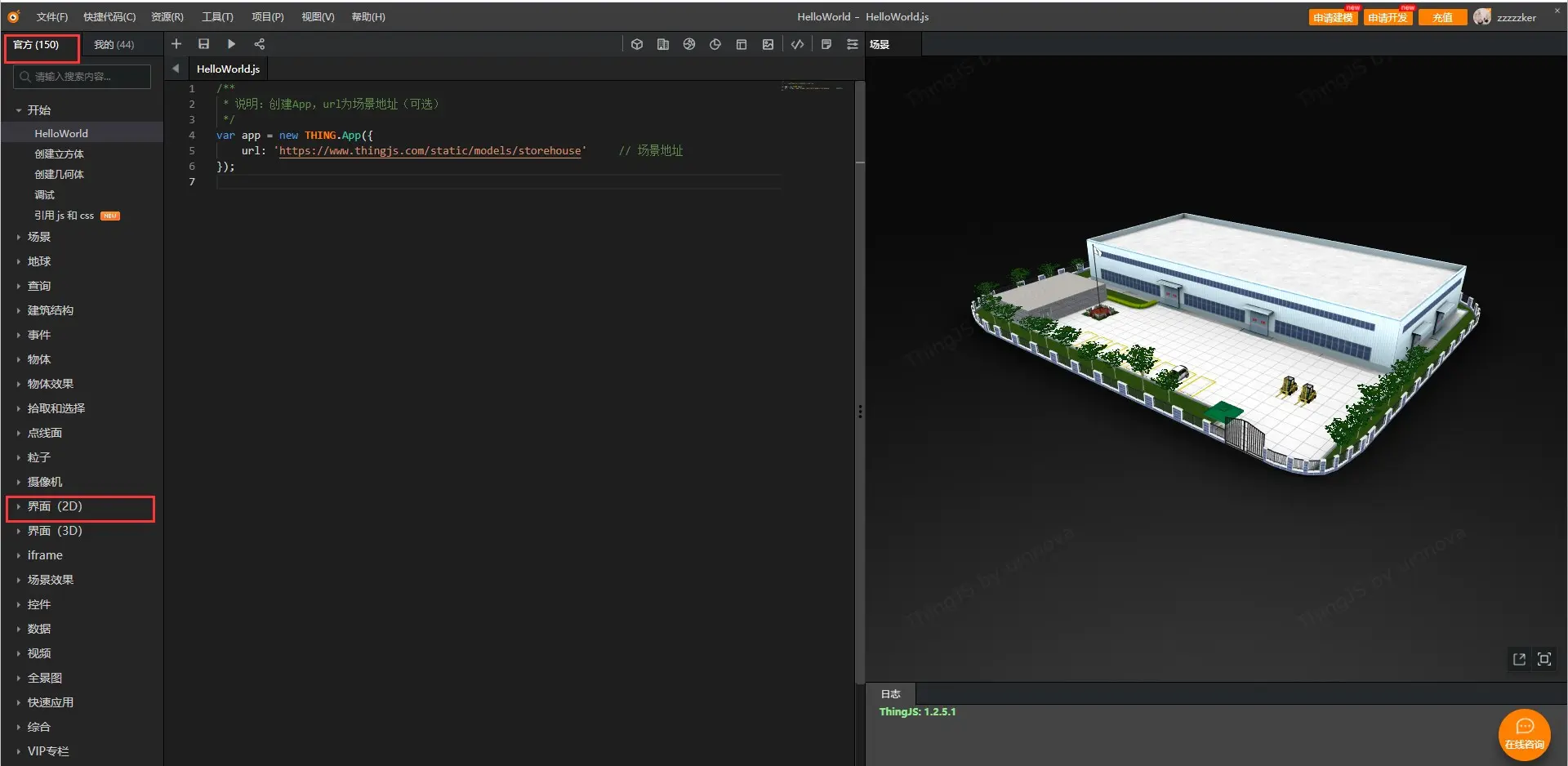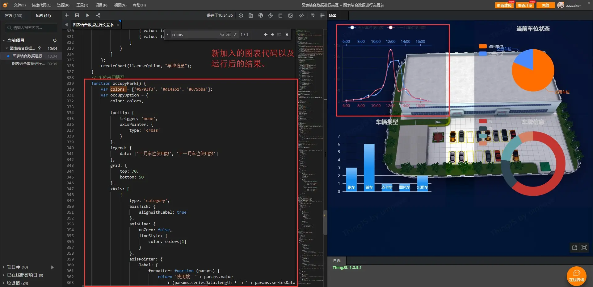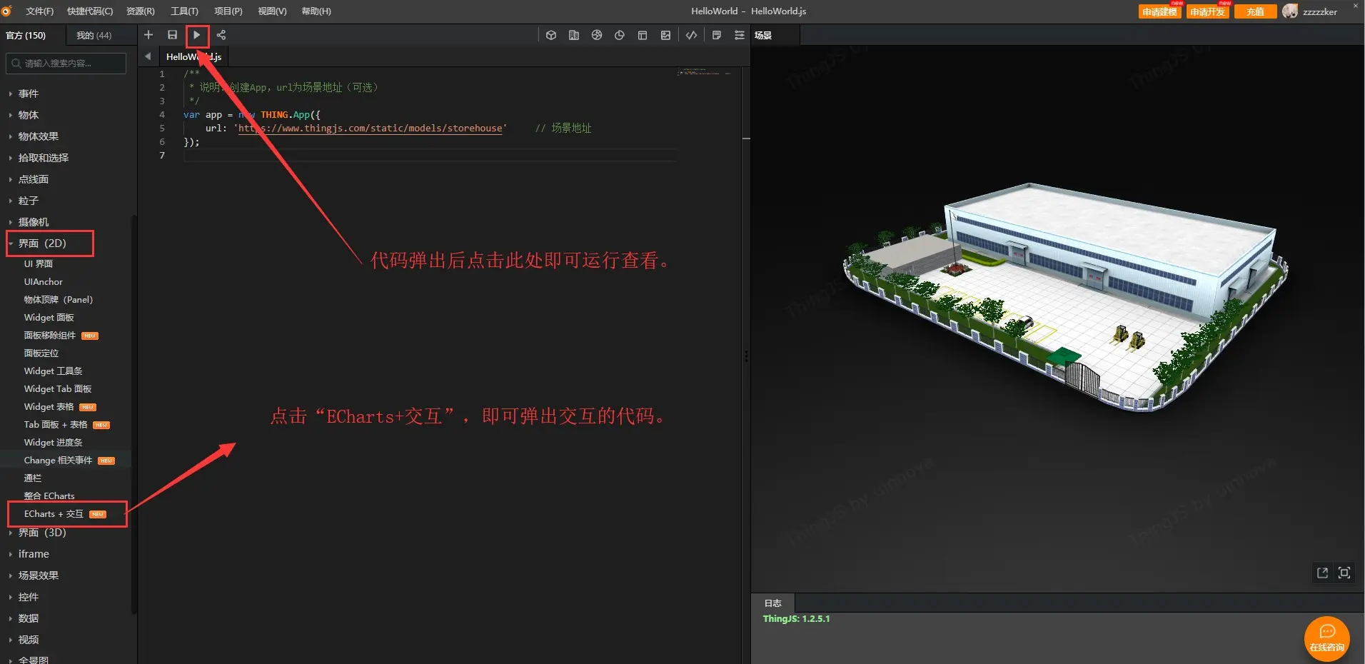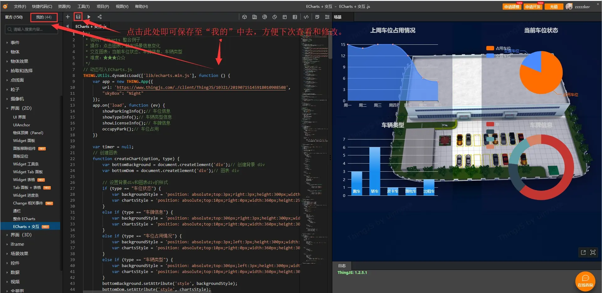 使用ThingJS在线开发即可快速使用Echarts图表结合三维场景!进入到ThingJS网站的在线开发中去,使用QQ或者微信快速登录,找到官方示例中的界面(2D),点击“Echarts + 交互”,出现对应代码后点击运行(三角形图标),可以查看到图表和三维场景进行交互了,但是这四个图表都不是我想要的,我该如何去修改呢?