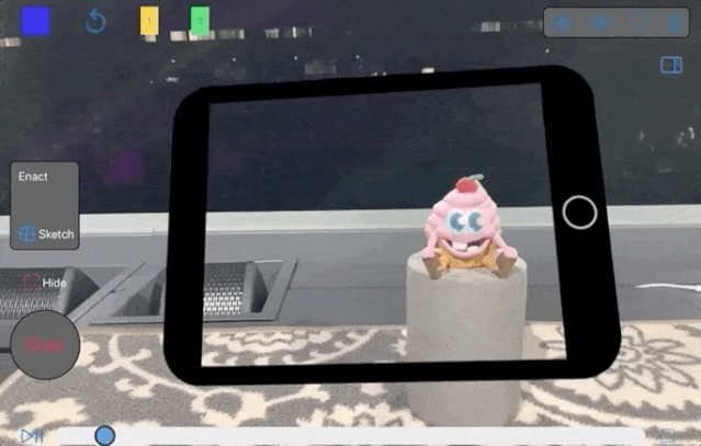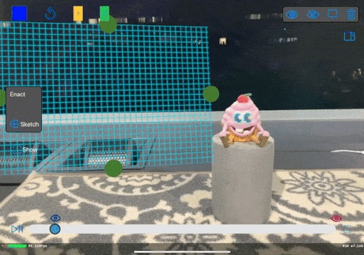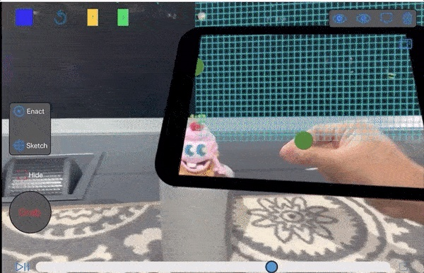 当你在空间里选定一个位置,轻轻一点,就会出现一个画板 (蓝色网格) ,让你在选好的地方画画了。手绘一个“Hi!”,再设置好时间。