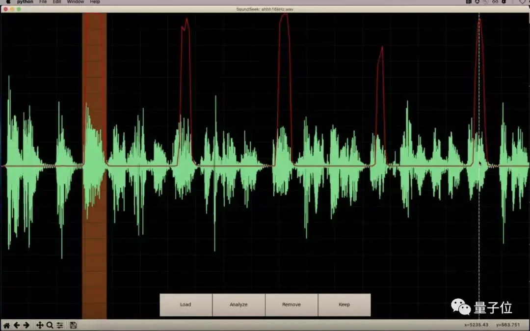 但有了SoundSeek的功能,只需要选中其中一个“呃”的波形,点击分析,AI就会帮你找出全部的“呃” (下图红色波峰) 。再来一键移除: