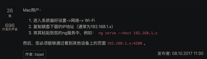 允许外部访问Angular本地项目 Vernie 2019-11-08 2,468 阅读1分钟 问题描述 让移动端也能登录网页查看本地项目 假设服务器已配置(来源:允许你的IP访问)。 解决方法 在终端运行`ng serve --host 0.0.0.0 打开网页:http://你的IP地址:4200 ` 参考链接 如何允许本地主机外部访问