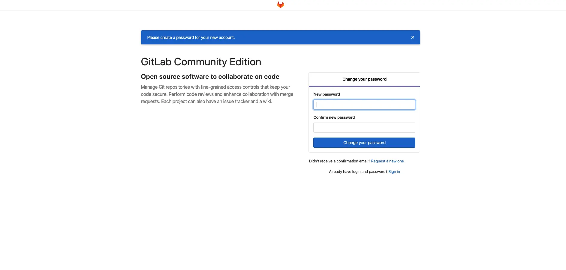 至此,服务器上已经安装了gitlab,在浏览器中打开 http://${服务器ip}:8080 就可以看到登录页面了