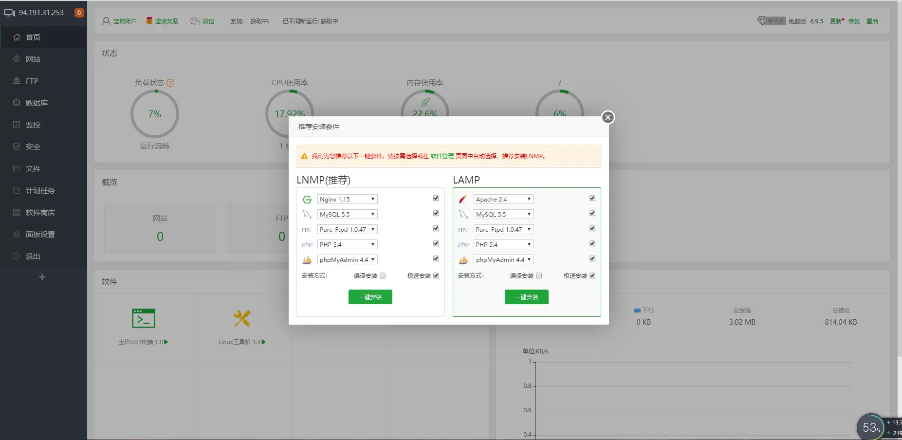 进来后 就需要你选择你需要的配置了 我们前端都是用的node 所以选择LNMP 然后就等他慢慢安装完毕吧