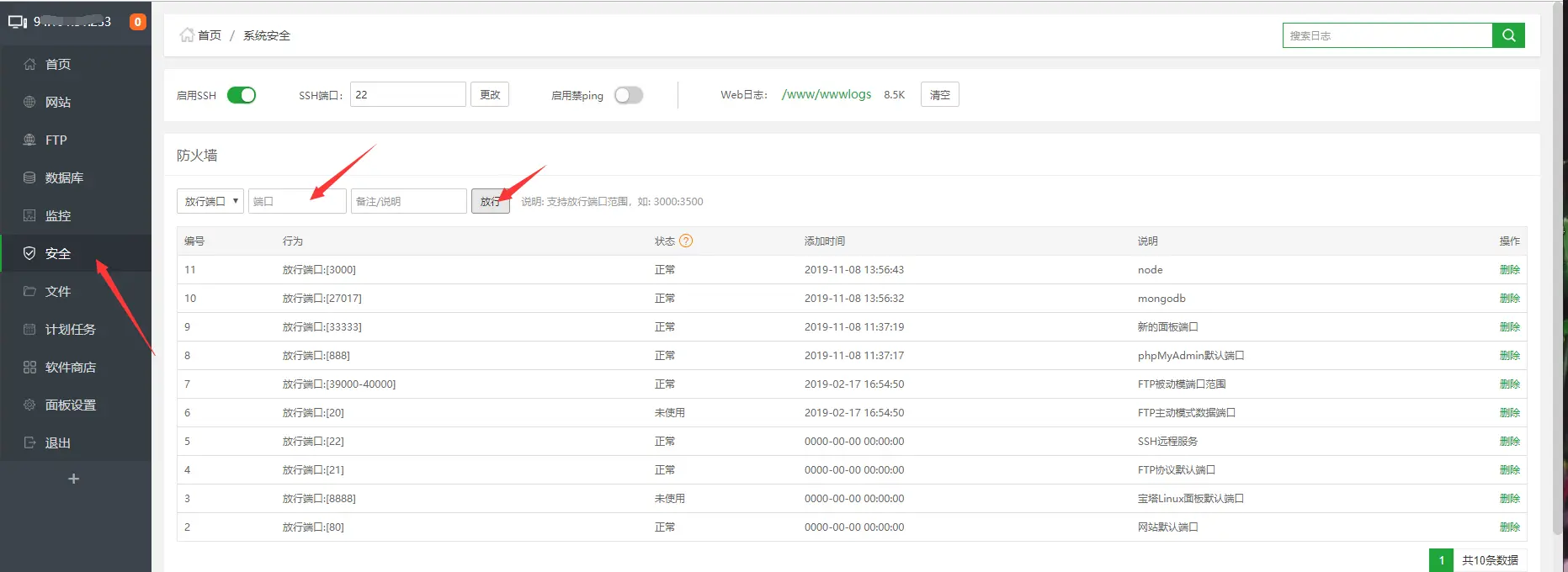 放行后再到宝塔面板里面也去把这两个端口放行了