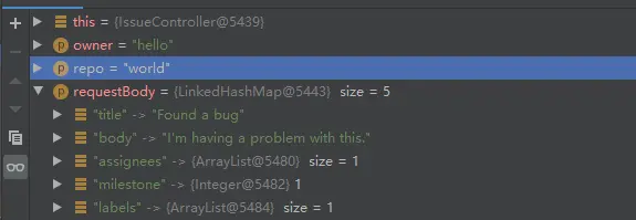 PostBody{title='Found a bug', body='I'm having a problem with this.', milestone=1, assignees=[octocat], labels=[bug]}。