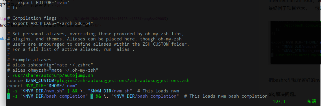 linux终端Bash换成zsh后,环境变量失效的解决方案 lenonrade 2019-11-08 3,170 阅读1分钟 安装了oh-my-zsh后,发现node,ng什么的命令都失效了,第一反映是环境变量失效,忘记了怎么配置,Search on the Internet half an hour。说多了都是泪,一直找不到解决方法。 最终问了项目老大,一句话点明了。 把bashrc里我配置好的nvm环境变量复制到 zshrc最下面。 ok,解决问题。