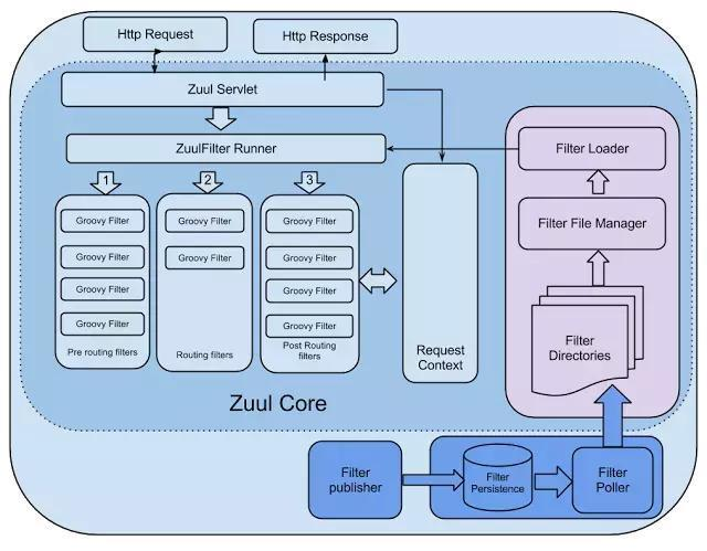 架构图右半部分,是zuul网关设计的自定义过滤器加载机制。网关内部会有生产者消费者模型,自动的将过滤器脚本发布到zuul网关读取加载运行。