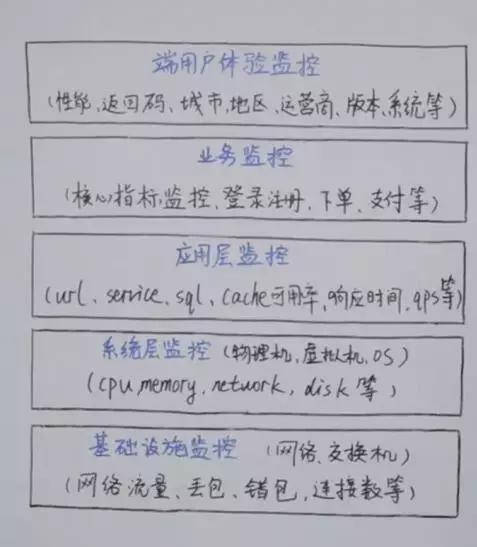 从基础设施到用户端,层层有监控,全方位,多角度,每一个层面都很重要。总体来说,微服务可分5个监控点:日志监控,Metrics监控,健康检查,调用链检查,告警系统