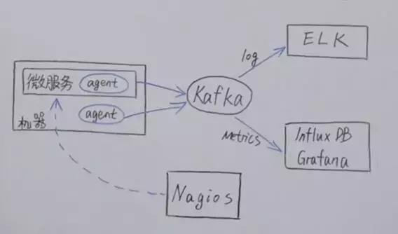 下面的图是大部分公司的一种监控架构图。每一个服务都有一个agent,agent收集到关键信息,会传到一些MQ中,为了解耦。同时将日志传入ELK,将Metrics传入InfluxDB时间序列库。而像nagios,可以定期向agent发起信息检查微服务。