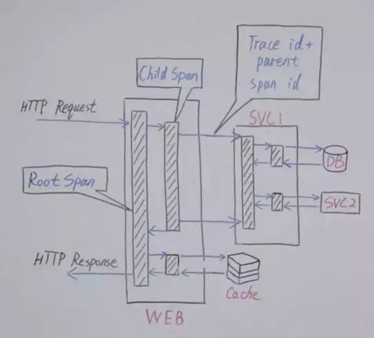 当请求进入Web容器的时候,会经过创建Tracer,连接spans(模拟潜在的分布式工作的延迟,该模块还包含在系统网络间传递跟踪上下文信息的工具包,如通过http headers)。Spans有一个上下文,其中包含tracer标识符,将其放在表示分布式操作的树的正确位置。当我们把图中的各种span放到后端的时候,我们的服务调用链会动态的生成调用链。