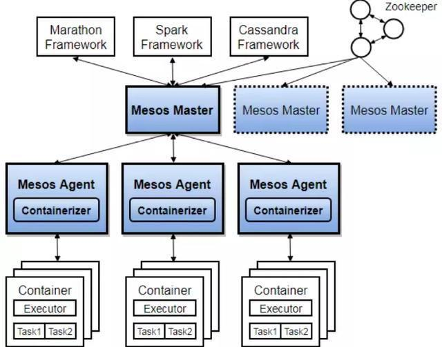 mesos是基于master,slave架构,框架决定如何利用资源,master负责管理机器,slave会定期的将机器情况报告给master,master再将信息给框架。master是高可用的,因为zk,也有leader的存在。下面是架构图