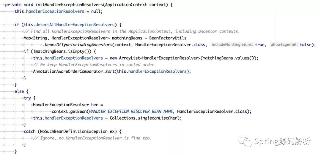 它从ApplicationContext中查询所有HandlerExceptionResolver bean,然后排序,上边这就是初始化工作.