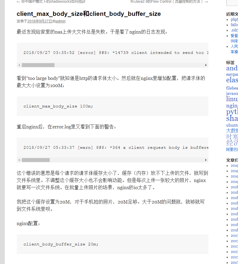 client_max_body_size 默认 1M,表示 客户端请求服务器最大允许大小,在“Content-Length”请求头中指定。如果请求的正文数据大于client_max_body_size,HTTP协议会报错 413 Request Entity Too Large。就是说如果请求的正文大于client_max_body_size,一定是失败的。如果需要上传大文件,一定要修改该值。