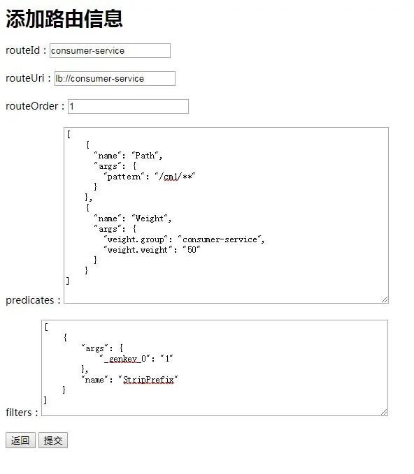 5.通过 dynamic-route 项目新增一条路由信息,路由的 uri 是consumer-service,且发布路由