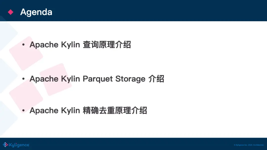 大家好,我是来自 Kyligence 的大数据开发工程师陶加涛,毕业之后就一直在 Kyligence 从事 Apache Kylin 的商业版本的研发。主要参与实现基于 Spark 的新一代的查询和构建引擎。今天议程分为三个方面:首先我会简单介绍下 Apache Kylin 以及它的查询原理,接下来我会介绍我们团队一直在做的 Parquet Storage,这个预计会在今年年底贡献回开源社区,最后我会介绍社区用户使用非常广泛的精确去重以及其在 Kylin 中的实现以及一些扩展。
