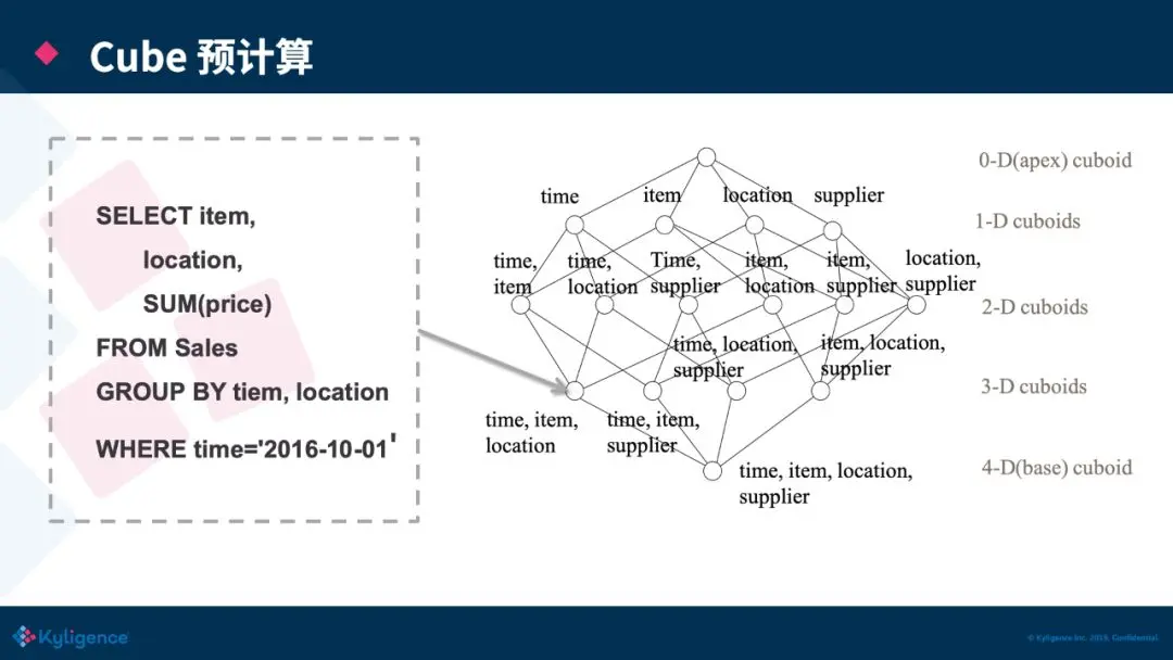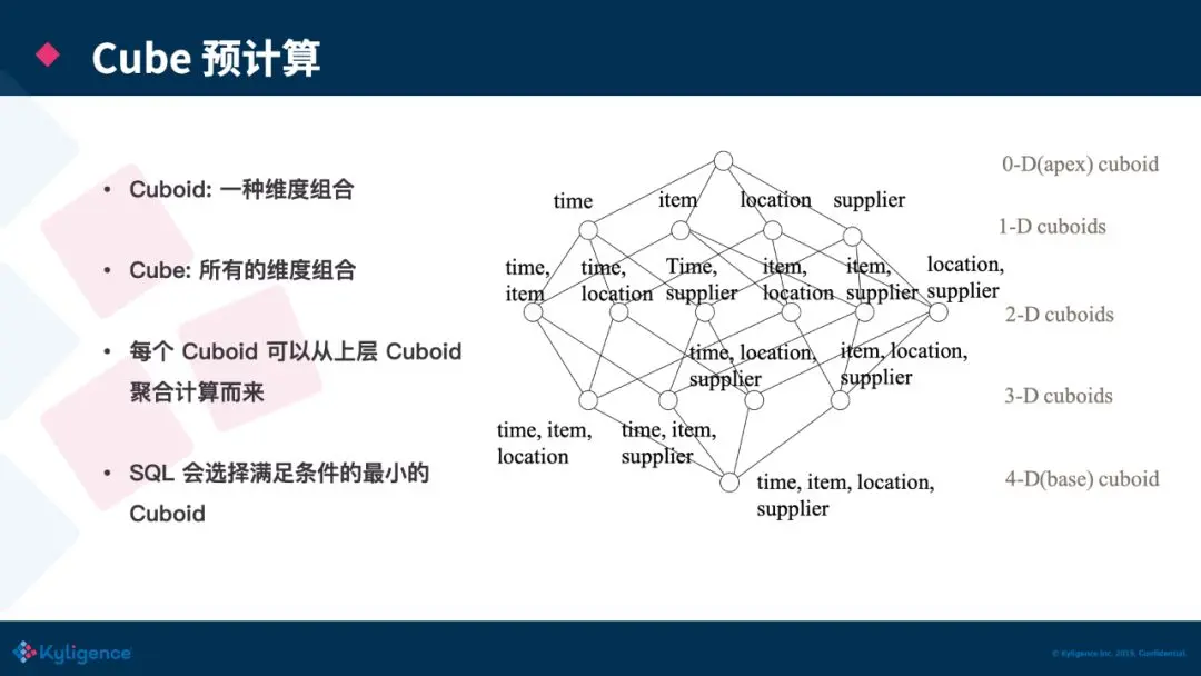 Kylin 的理论基础是 Cube 理论,每一种维度组合称之为 Cuboid,所有 Cuboid 的集合是 Cube。其中由所有维度组成的 Cuboid 称为 Base Cuboid,图中(time,item,location,supplier)即为 Base Cuboid,所有的 Cuboid 都可以基于 Base Cuboid 计算出来。Cuboid 我们可以理解为就是一张预计算过后的大宽表,在查询时,Kylin 会自动选择满足条件的最合适的 Cuboid,比如上图的查询就会去找Cuboid(time,item,location),相比于从用户的原始表进行计算,从 Cuboid 取数据进行计算能极大的降低扫描的数据量和计算量。