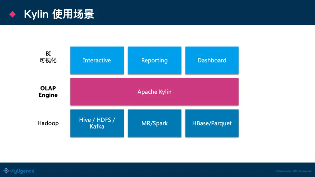 作为一个 SQL 加速层,Kylin 可以下接各种数据源,例如 Hive/Kafka,上接各种 BI 系统,比如 Tableau,PowerBI,也可以直接进行 Ad hoc 的查询。