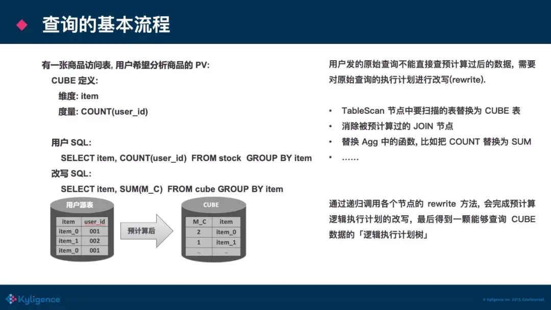 1SELECT item,COUNT(user_id) FROM stock GROUP BY item;这条 SQL 发给 Kylin 后,Kylin 不能直接的用它原始的语义去查我们的 Cube 数据,这是因为的数据经过预计算后,每个 item 的 key 只会存在一行数据,原始表中相同 item key 的行已经被提前聚合掉了,生成了一列新的 measure 列,存放每个 item key 有多少 user_id 访问,所以 rewrite 的 SQL 会类似这样: