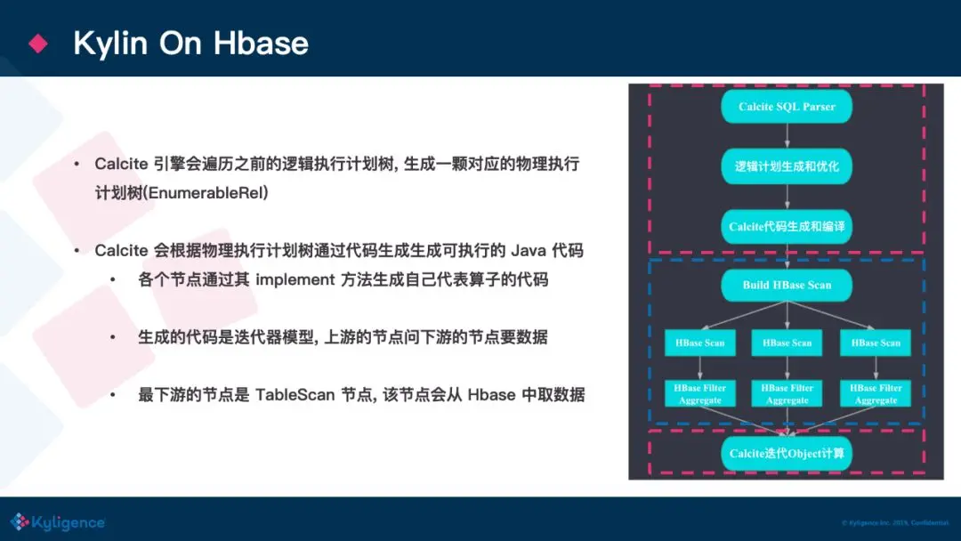 在目前开源版本的实现中,构建完的数据是存储在 HBase 中的,在上面小节中,我们得到了一个能够查询 Cube 数据的逻辑执行计划,Calcite 框架会根据这个逻辑执行计划生成对应的物理执行计划,最终每个算子都会通过代码生成生成自己算子的可执行代码,这个过程是一个迭代器模型,数据从最底层的 TableScan 算子向上游算子流动,整个过程就像火山喷发一样,故又名 Volcano Iterator Mode。而这个 TableScan 生成的代码会从 HBase 中取出 Cube 数据,当数据返回到 Kylin 的 Query Server 端之后,再被上层的算子一层层消费。