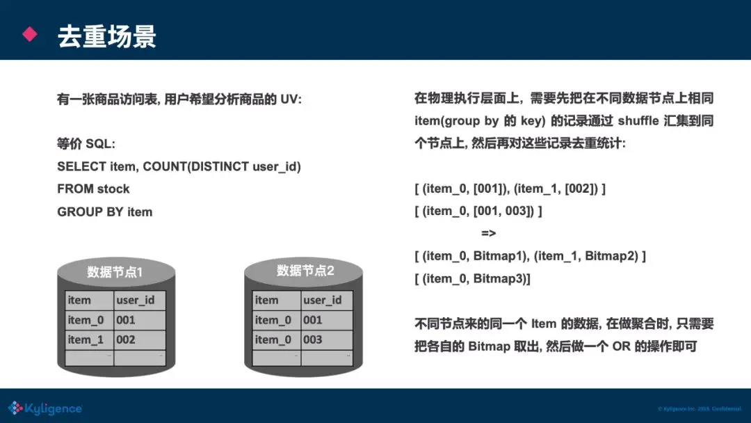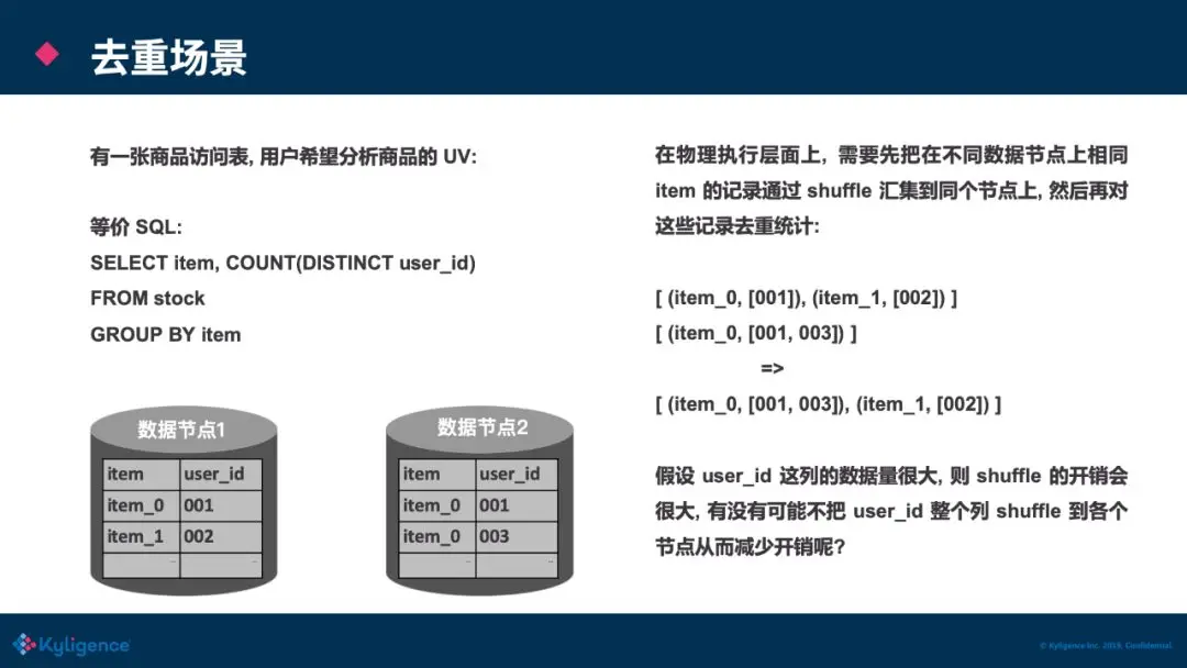 我们从物理执行层面上想一下这句 SQL 背后会发生什么故事:首先分布式计算框架启动任务,从两个节点上去拿数据,因为 SQL group by 了 item 列,所以需要以 item 为 key 对两个表中的原始数据进行一次 shuffle。我们来看看需要 shuffle 哪些数据:因为 select/group by了 item,所以 item 需要 shuffle 。但是,user_id 我们只需要它的一个统计值,能不能不 shuffle 整个 user_id 的原始值呢?