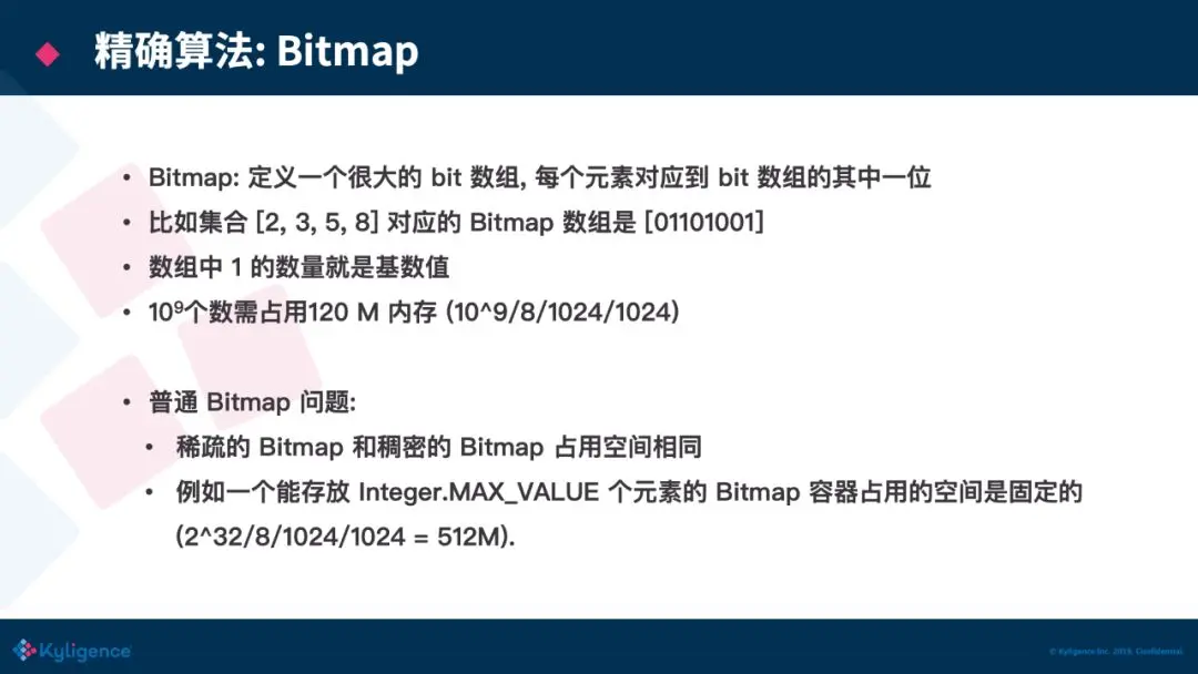 第一种要介绍的算法是一种精确的去重算法,主要利用了 Bitmap 的原理。Bitmap 也称之为 Bitset,它本质上是定义了一个很大的 bit 数组,每个元素对应到 bit 数组的其中一位。例如有一个集合[2,3,5,8]对应的 Bitmap 数组是[001101001],集合中的 2 对应到数组 index 为 2 的位置,3 对应到 index 为 3 的位置,下同,得到的这样一个数组,我们就称之为 Bitmap。很直观的,数组中 1 的数量就是集合的基数。追本溯源,我们的目的是用更小的存储去表示更多的信息,而在计算机最小的信息单位是 bit,如果能够用一个 bit 来表示集合中的一个元素,比起原始元素,可以节省非常多的存储。